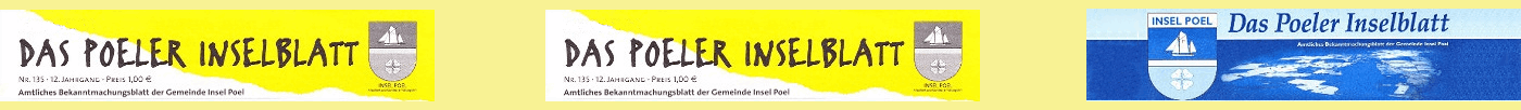Jürgen Pump. Neben den amtlichen Mitteilungen enthielt und enthält das Inselblatt eine Vielzahl von interessanten Artikeln zum aktuellen Geschehen sowie zur Geschichte der Insel und stellt somit eine interessante Quelle auch zur jüngsten Inselgeschichte dar. Mit freundlicher Genehmigung der Gemeindeverwaltung Insel Poel habe ich hier die Jahrgänge 1990-2011 eingestellt, wo sie für jeden Interessierten abrufbar sind. Die Jahrgänge